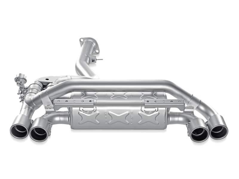 Utilizing a single muffler arrangement, the fully titanium Akrapovic Slip-On is designed to be modular. In its basic mode, all exhaust gases flow through the muffler, giving you a deeper rumble of an exhaust note compared to stock without any drone. However, the muffler system is built in such a way that by replacing a blocking plate with the optional Akrapovic sound kit valve system the driver is able to noticeably increase the volume of the exhaust at the press of a button. Once activated, the majority of the exhaust gases route through the muffler bypass outlets. Even when installed on an otherwise stock vehicle, power gains are achieved and weight reduction realized. Complete the look with a set of four exquisite tailpipes in titanium or carbon fibre.